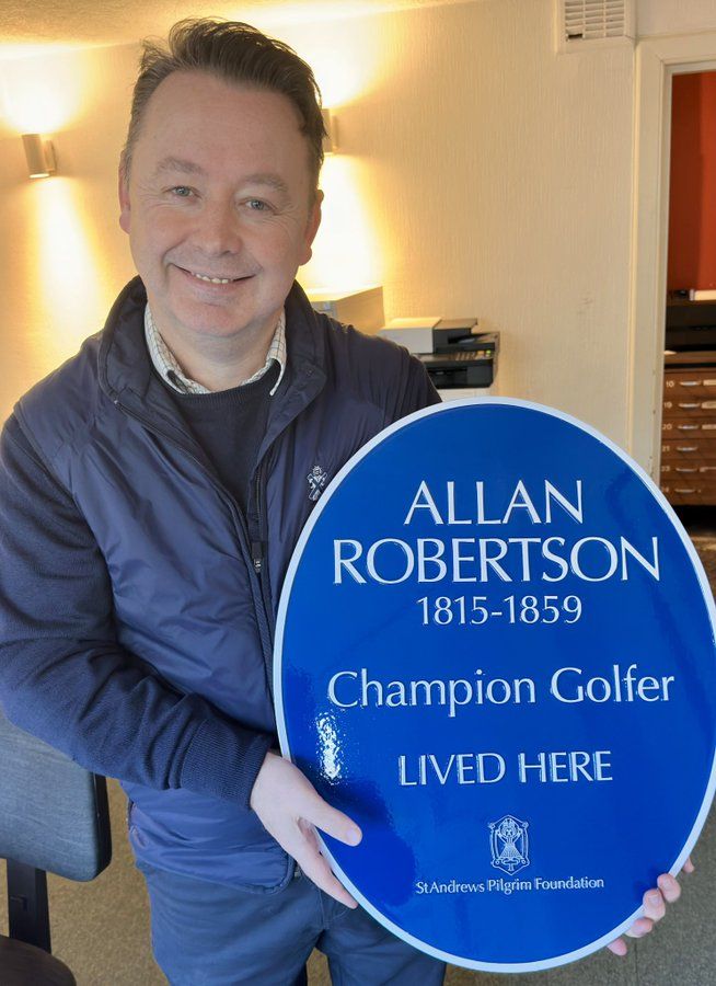St Andrews veut, à nouveau, mettre Allan Robertson en avant en précisant où il habitait à St Andrews. Sur le coin de Golf Place et de la Links Road juste à côté du green du 18 du Old Course.
