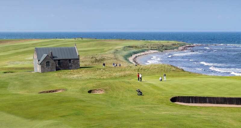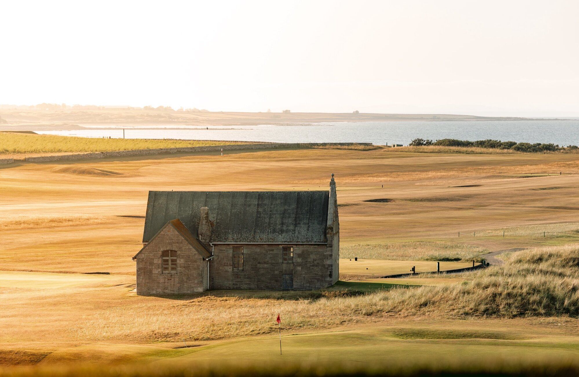 Voici à quoi ressemble le Crail Golf Club.Les fairways et les surroundings sont “brown and crispy” comme aiment les vrais golfeurs de links.Assez étonnant, cette maison au milieu du Balcomie Links, un des deux parcours de Crail.Aujourd'hui, cette maison est utilisée par les greenkeepers pour y ranger du matériel. Ce qui n'était pas le cas avant.Lorsque Old Tom Morris dessina le parcours en 1894, des gens y habitaient.Old Tom en tenait compte et fit construire le parcours autour de la maison.