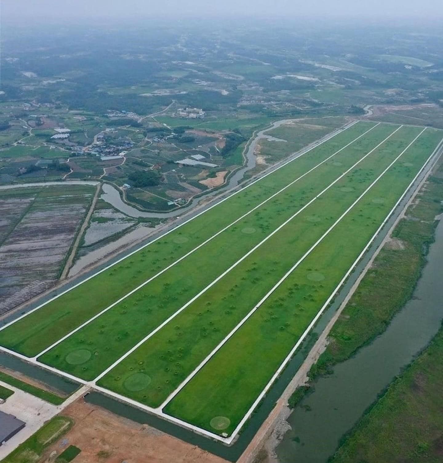 En Corée du Sud, on a construit un drôle de parcours de golf sur un terrain carré.Ils ont utilisé chaque m² et réalisé des trous à des niveaux différents.Sans oublier de nombreux potbunkers pour corser le tout.Le clubhouse ? En bas à gauche.
