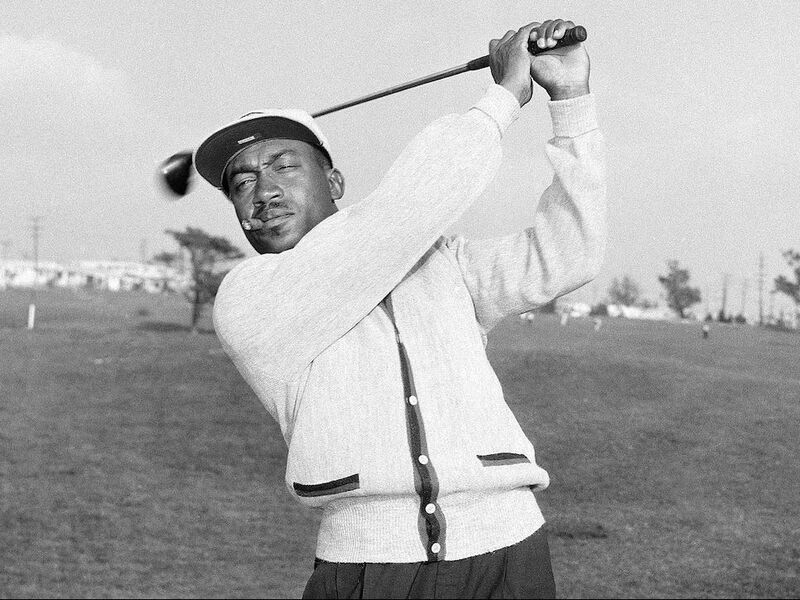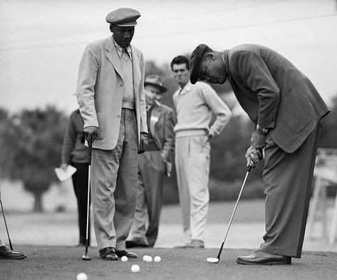 Joe Louis, champion du monde de boxe, qui putte, sous l'oeil de Bill Spiller, sur le green d'entraînement du Phoenix Open 1952.Ils ont pu participer après que le PGA Tour adapta sa “Non-Caucasian Rule”, où seul les Américains blancs pouvaient jouer leurs tournois.Ce n'est qu'en 1961 que cette règle fut supprimée et que les “Non-Caucasians” pouvaient être membres du PGA Tour.