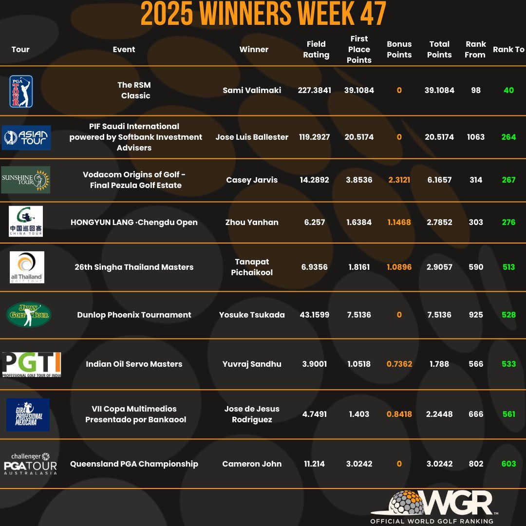 Le week-end dernier, neuf compétitions comptant pour le classement mondial officiel de golf ont eu lieu dans le monde entier.