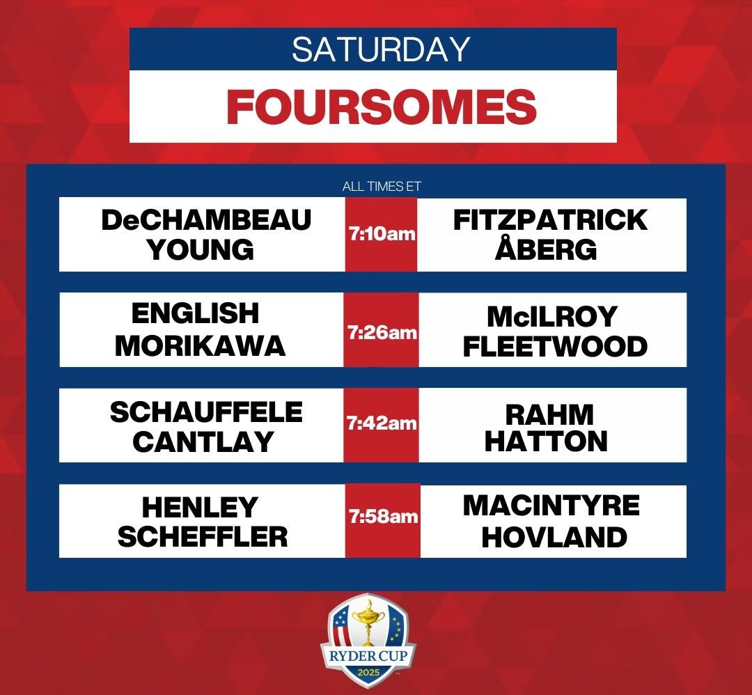 Voici le line-up des foursomes de ce samedi. Début à 13h10 heure belge.
