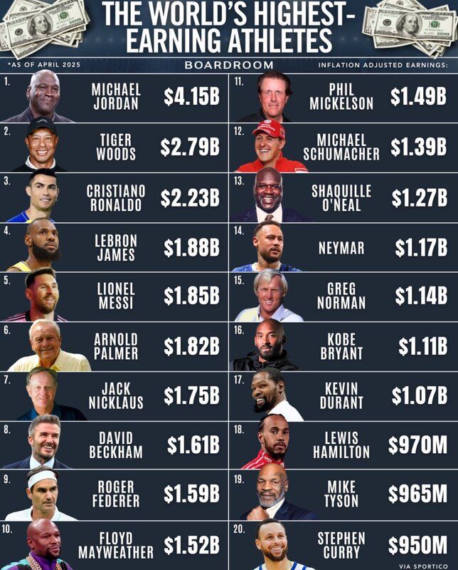 Tiger Woods le suit avec pratiquement 2,8 milliards dollars. Un peu plus que Cristiano Ronaldo.