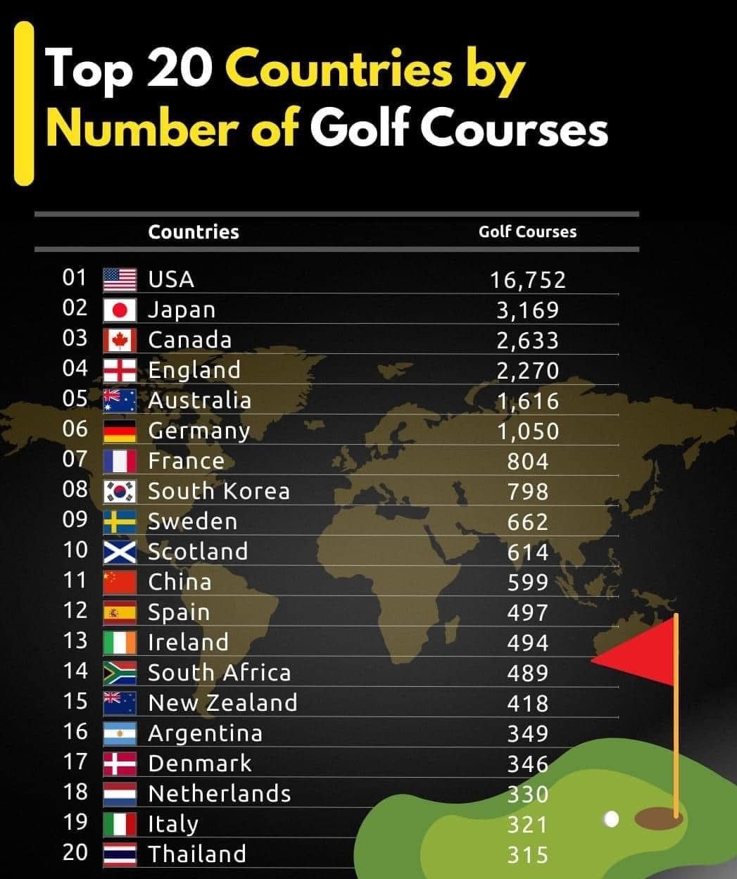 Il y aurait 16.752 parcours de golf aux Etats-Unis.Loin devant tous les autres pays.Le Japon est le solide numéro deux. Le Canada. l'Angleterre et l'Australie complètent le top 5.La Belgique ne fait, bien entendu, pas partie de cette liste...