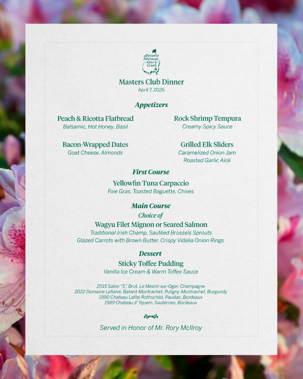 Rory McIlroy, en tant qu'hôte du traditionnel dîner des champions organisé le mardi soir avant le Masters, a dévoilé le menu.