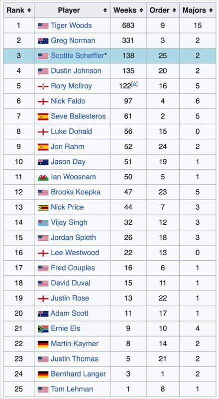 Il a dépassé Dustin Johnson mais est encore très loin de Tiger Woods et Greg Norman.Rory McIlroy est, pour l'instant, cinquième, devant les légendes Nick Faldo et Seve Ballesteros.Tous les numéros un mondiaux