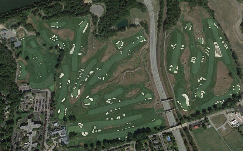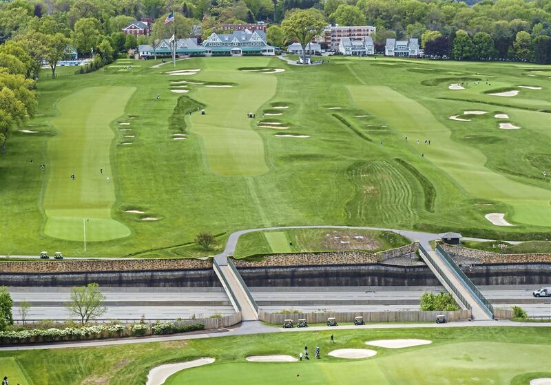 Elles montrent que le prestigieux parcours est coupé en deux par une autoroute.Des ponts au-dessus de la Pennssylvania Turnpike, appelées la “76”, permet d'aller d'un trou à l'autre.Il faut passer la "76" du trou 1 au 2, et ensuite du 8 au 9.