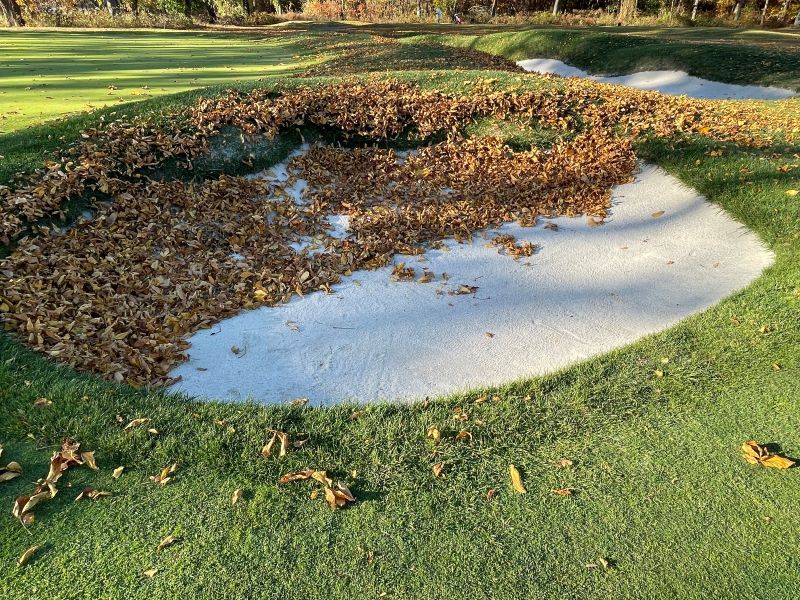Un situation d'automne.Votre balle devrait se trouver ici.Un peu d'indulgence pour les greenkeepers qui ne savent souffler les feuilles partout en même temps.