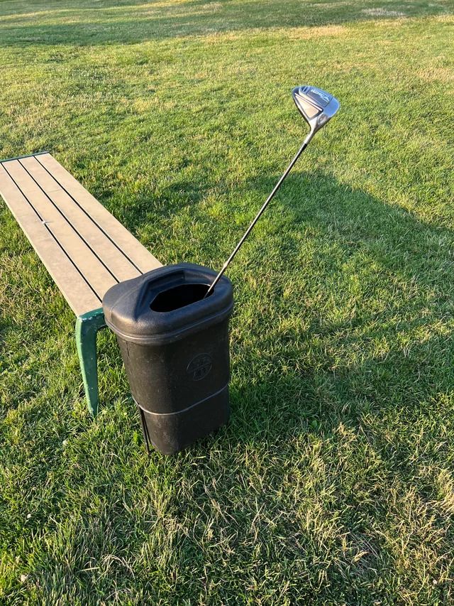 Une image prise sur un parcours de golf.Un driver explosé dans une poubelle.Sans doute un joueur qui en avait assez du golf.Ou juste de son driver…?