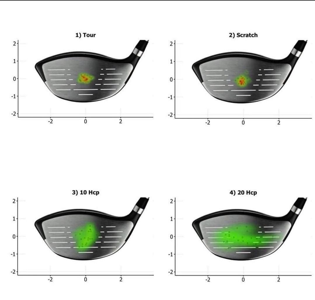 Dit is hoe een Tourspeler, een scratch handicapper, een hcp 10- en een hcp 20-speler de bal raken met hun driver. Duidelijk toch.Meteen weet je waarom een "vergevende" driver je kan helpen