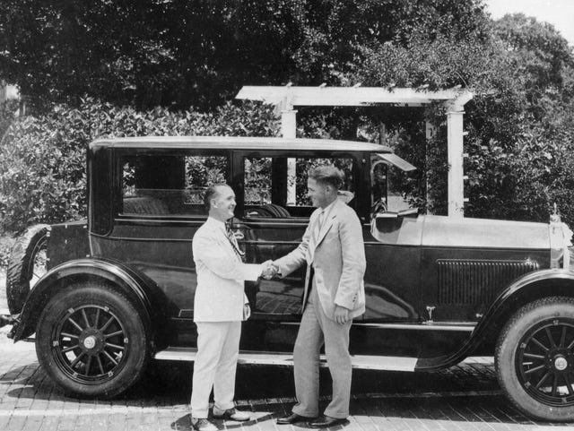 Als amateur kreeg Bobby Jones geen prijzengeld, maar wel cadeaus om ergens te starten of goed te presteren. Zoals hier, auto's.