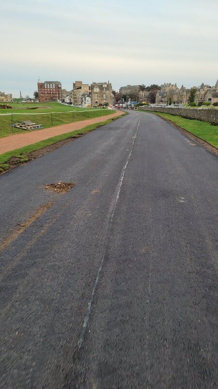 De weg achter de zeventiende hole van de Old Course in St Andrews kreeg een nieuwe asfaltlaag. Uiteraard beter dan de voorgaande.