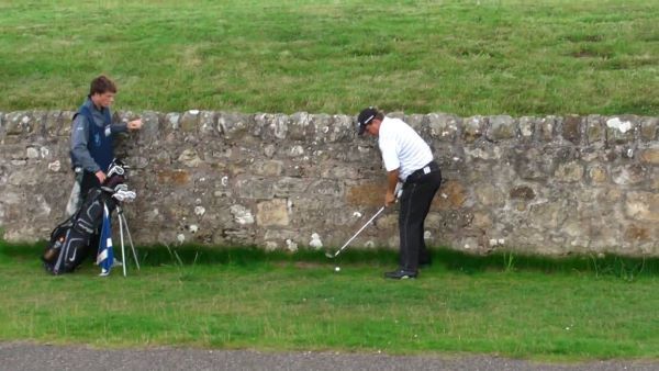 Wat vaak gebeurt, want meestal slaat men het shot naar de green op die “Road Hole” bewust té ver om de roemruchte“Road Bunker” voor de green te vermijden…