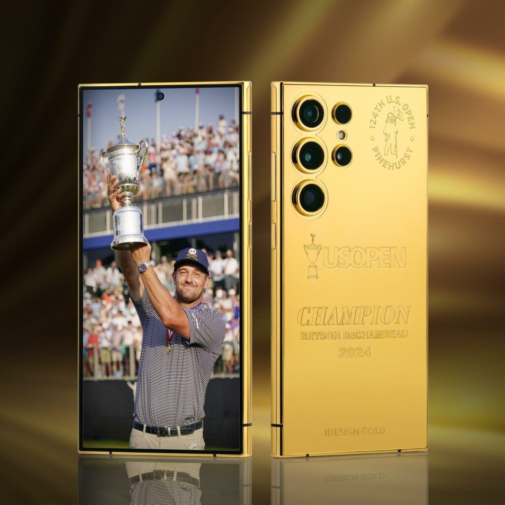 Bryson DeChambeau kreeg na zijn zege in de US Open een gepersonaliseerde gouden Samsung smartphone van iDesign Gold cadeau. Bryson uiteraard gelukkig.