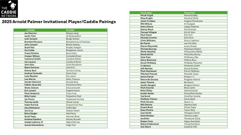 De Arnold Palmer Invitational geeft de caddies van de startende toppers steeds een welgemeende schouderklop. Men lijst alle caddies op met daarachter de spelers die ze dienen.