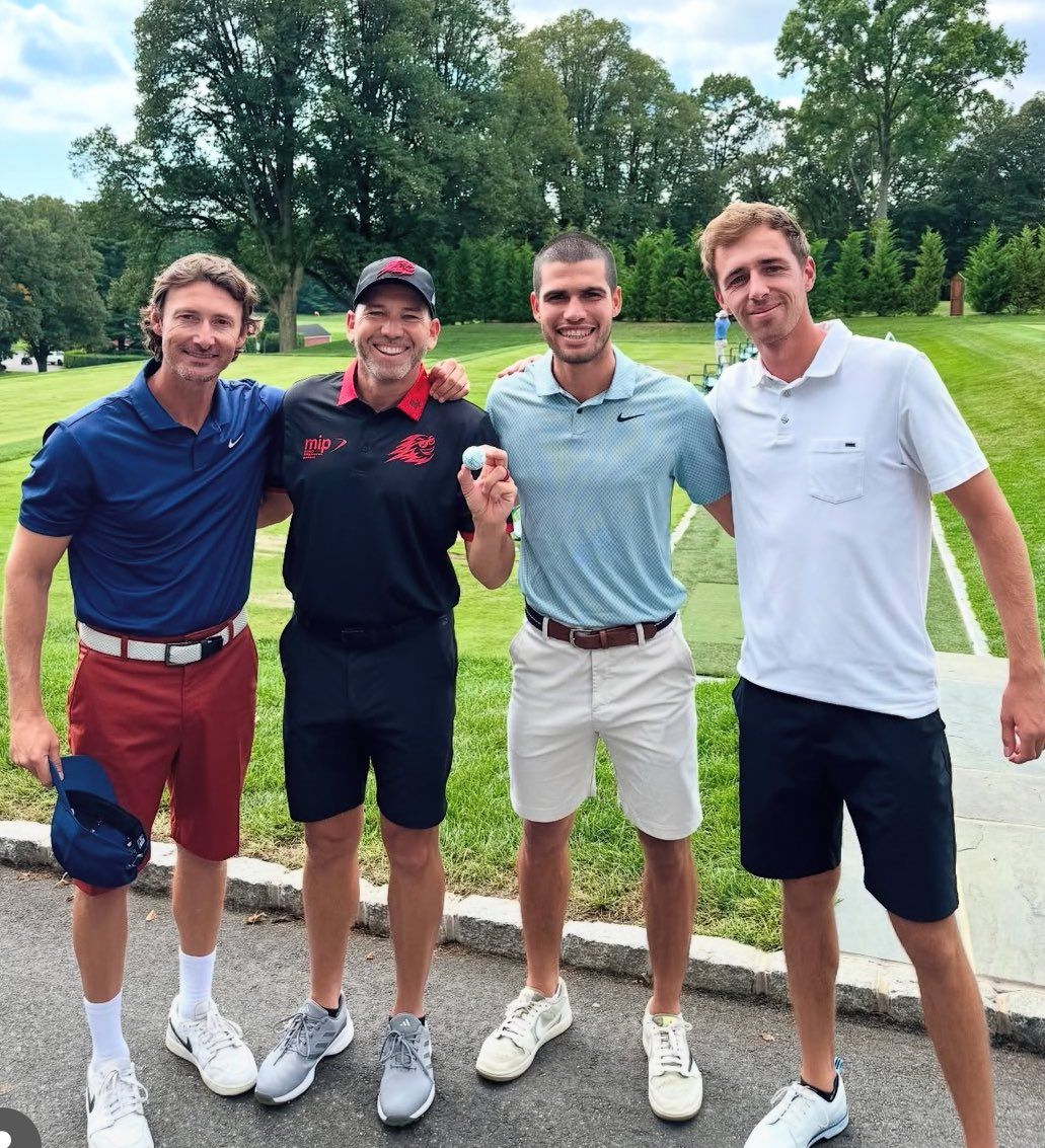 Carlos Alcaraz stapte bij zijn vrije dag in de US Open op het gras. Ditmaal niet dat van Wimbledon waar hij in 2023 en 2024 won, maar wel dit van een New Yorkse golfbaan.