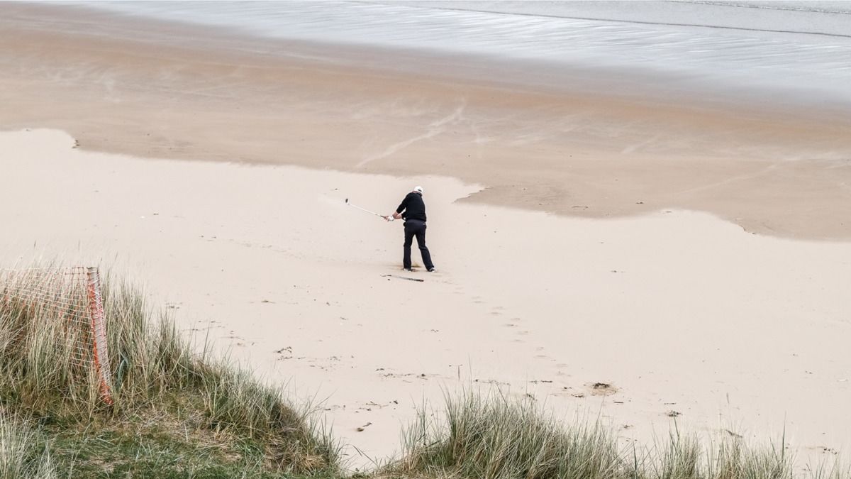 Een beeld dat je op zowat iedere links course kan zien. Hier het Schotse Cruden Bay.Wind deed een afzwaaiende slice de bal van deze golfer op het belendende strand landen. Geen out-of-bounds, dus play as it lies. Cleane hit terug naar de fairway of dicht bij... of zelfs op de green.