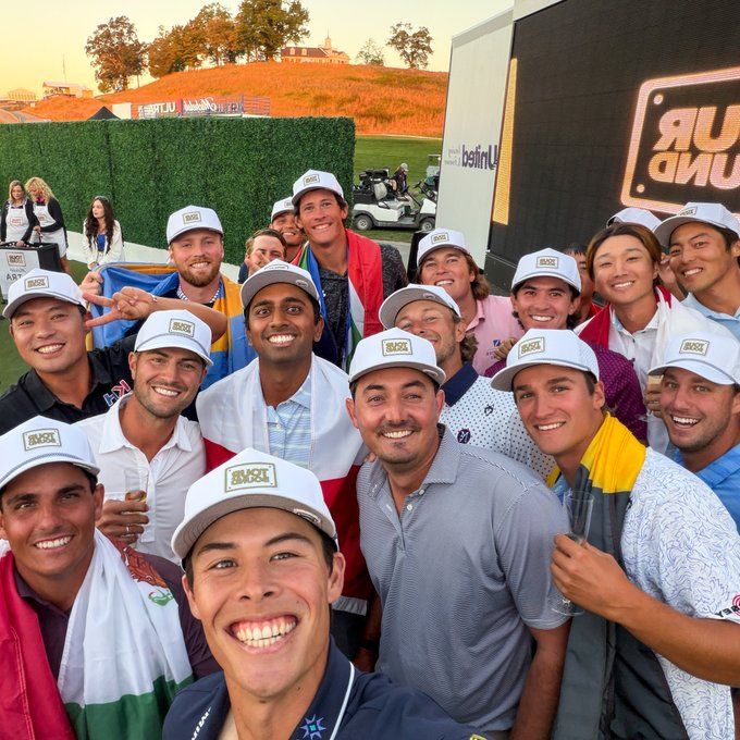 Deze golfers hebben alle redenen om breed te lachen. Na het seizoenafsluitende Korn Ferry Tour Championship kregen ze een US PGA Tour-kaart. Met Adrien Dumont de Chassart rechts vooraan. Chandler Blanchet won het Korn Ferry Tour Championship waar ADdC als 18de finishte.
