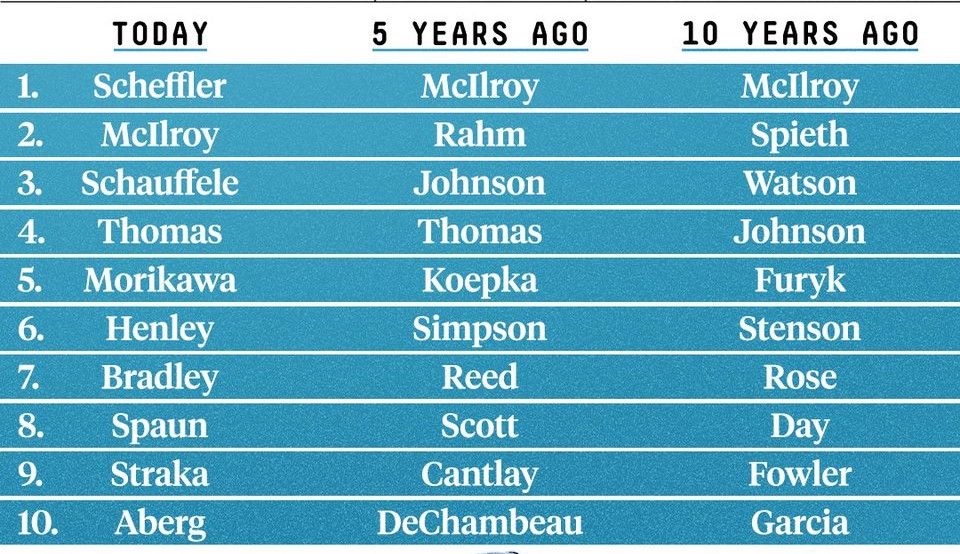 Dit zijn de top 10's van tien jaar en vijf jaar geleden en de huidige.Eén constante in die rankings. Rory McIlroy staat steeds ergens bovenaan.Achter hem héél wat wijzigingen.