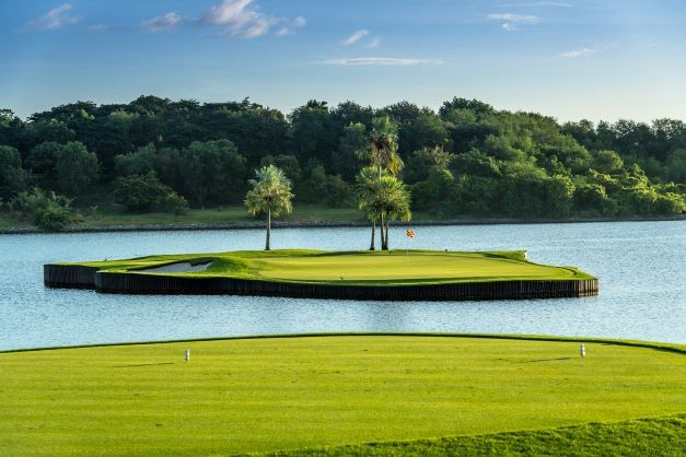 De 17de hole van TPC Sawgrass wordt als eilandgreen aangeduid,… maar is dat niet. Je kan via een weg naar de green stappen. Niet op Amata Spring Country Club in het Thaise Chonburi. Daar is de green van de 17de hole écht een eiland. Zelfs een drijvend eiland waardoor de afstand naar de green door verankering kan gewijzigd worden. Daar naar toe moet met een bootje.