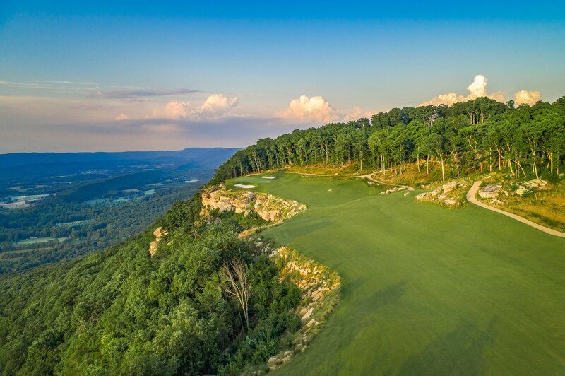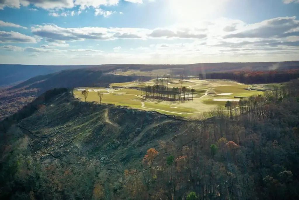 Een luchtbeeld van een bebost plateau in Georgia Mountains. Daar bouwde men The McLemore. Ontbossen en dan de fairways, greens en andere dingen aanleggen. Het zoveelste bewijs dat je haast overal golfbanen kan creëren.Rees Jones maakte er een “mountain meets sky”-baan van met eindloze zichten van over de 100 km. Ook in de States uniek.