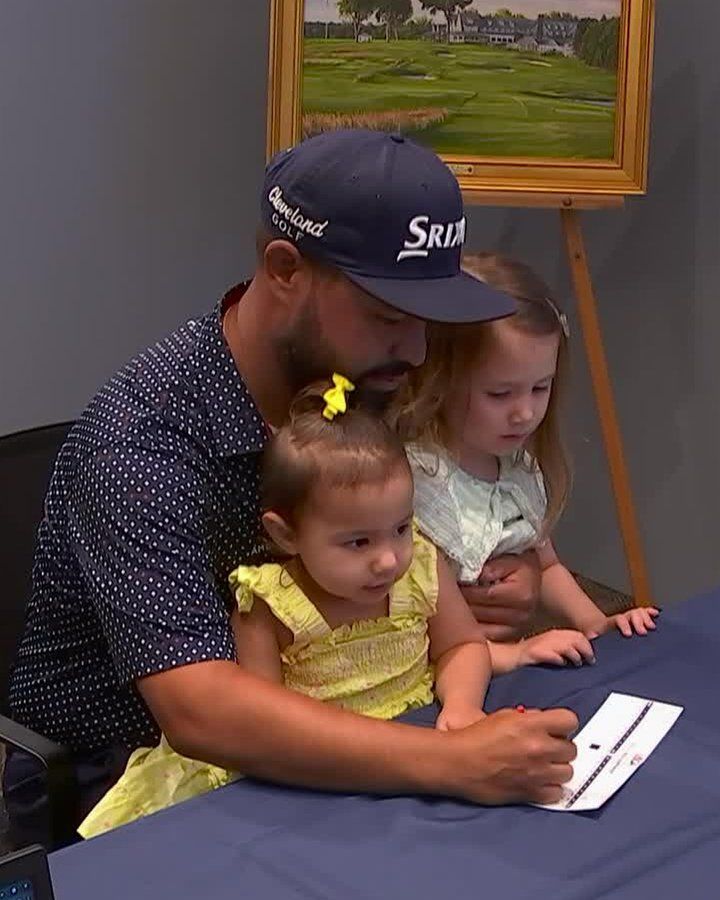 J.J. Spaun tekent na de US Open zijn scorekaart. Samen met dochtertjes Emerson en Violet.