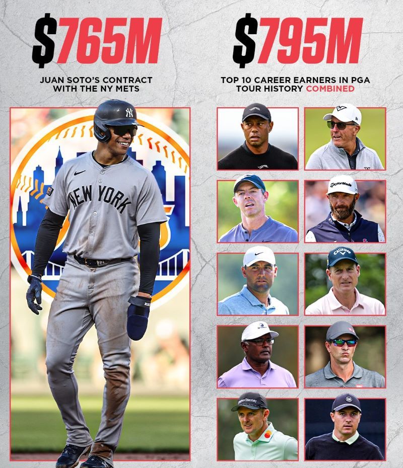 Juan Soto ondertekende een vijftienjarig contract met New York Mets. De 26-jarige Dominicaanse baseballer verdient er… 765 miljoen dollar mee. Haast zoveel als de top 10 van de US PGA Tour in hun hele carrière.