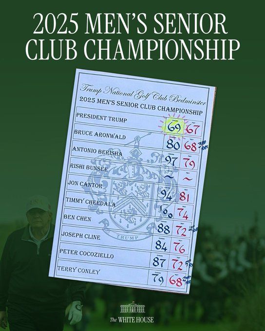 Het Witte Huis heeft de scorekaart van het Senior Club Championship op Trump Bedminster vrijgegeven. Met uiteraard “the Donald” helemaal bovenaan en dus met 69 netto en 67 bruto “champion”. Hij zou nu handicap 2,8 achter zijn presidentiële naam hebben. Zijn beste handicap ooit…