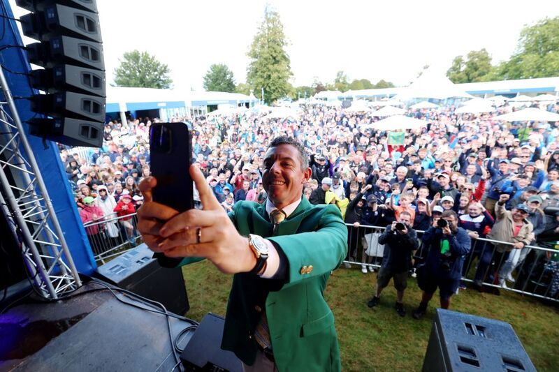 Rory McIlroy werd voor de Irish Open vanop een tribune en veel toeschouwers uitgebreid gevierd voor zijn Grand Slam. De trofeeën en uiteraard zijn groen Mastersjasje waren er uiteraard.