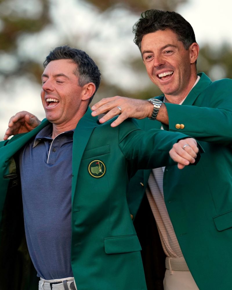 Titelverdediger Rory McIlroy die zichzelf in het groene Mastersjasje helpt.