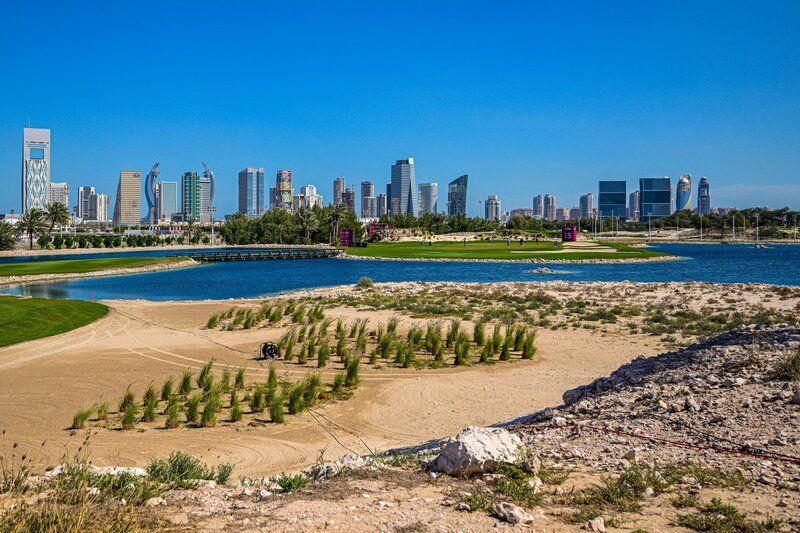 De elfde hole van de Doha Golf Club waar de Qatar Masters gespeeld wordt. De par 4 meet 433 meter van de back tee. Je moet van de tee wel een klap van 230 meter carry hebben om de ver gelegen fairway te halen. De rest is zand…