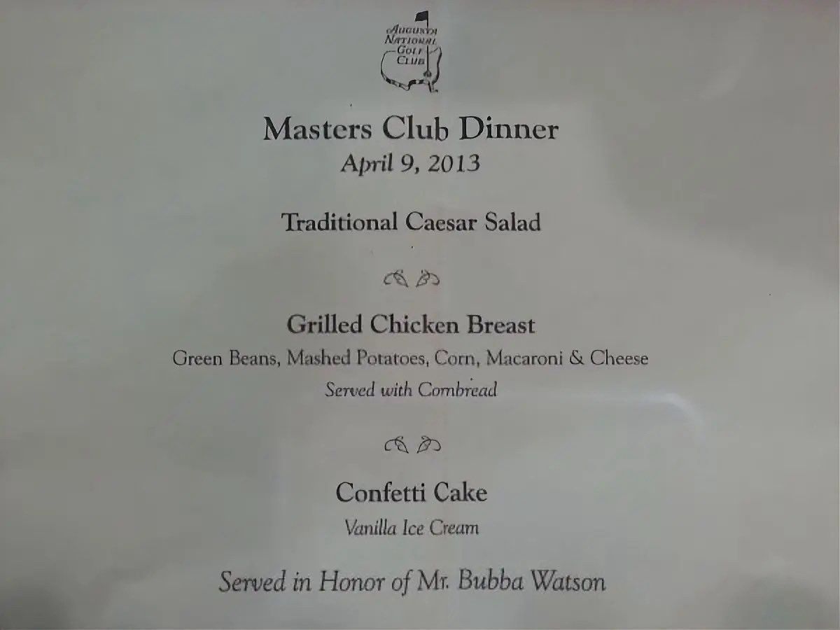 De menu’s van het Champions Dinner verschillen door de jaren heen uiteraard. Sommigen gaan voor het meest exquise, anderen voor simpele dingen.Zoals Bubba Watson in 2013. Die bood alleen maar Caesar Salad, kip en vanille ijs aan. Meer niet.Iedereen heeft er van genoten…