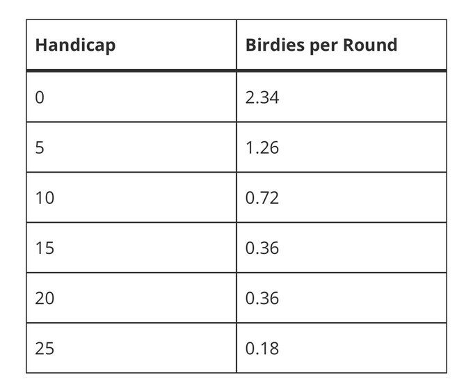 Shotscope rekende uit hoeveel birdies een bepaalde handicapspeler per ronde haalt. Een scratch handicapper haalt gemiddeld 2,34 birdies per ronde. Een handicap 25-speler moet tevreden zijn met gemiddeld 0,18.