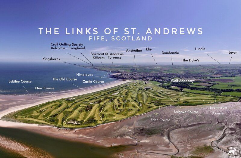 In de onmiddellijke regio van St Andrews zijn er heel wat golfbanen. St Andrews Links runt er zeven. Die zijn in het wit vermeld.