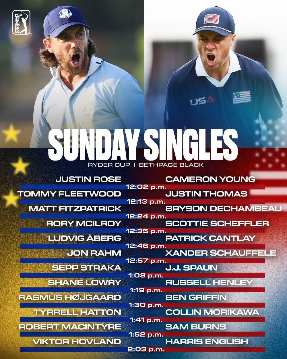 2 puntjes. Dus twee zeges volstaan voor Team Europe om de Ryder Cup te behouden.Captain Luke Donald wil die zege zo snel mogelijk behalen.Daarom zet hij zijn “kanonnen” vooraan in de line-up van de single matches. Wat conculega Keegan Bradley uiteraard verwachtte. Ook zet zijn hoofdmacht meteen in. Hopend op een mirakel?Het is vooral uitkijken naar het verhoopte duel Rory McIlroy versus Scottie Scheffler.