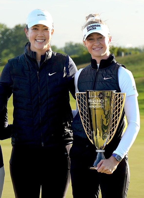 Nelly Korda is uiteraard de blikvangster in deze wedstrijd waar Michelle Wie gastvrouw is.