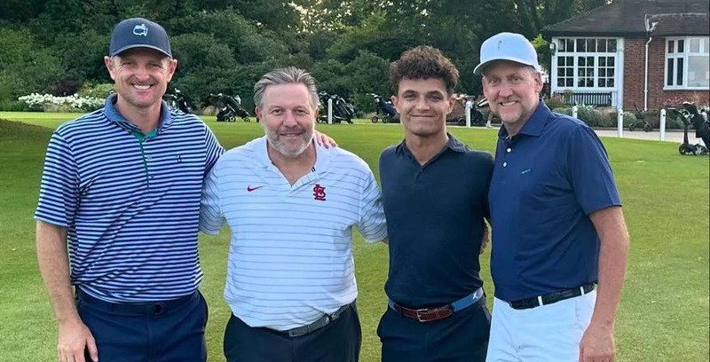 Zak Brown, de CEO van McLaren Racing, is een fervente golfer. Hier samen met zijn piloot Lando Norris, Justin Rose en Ian Poulter.