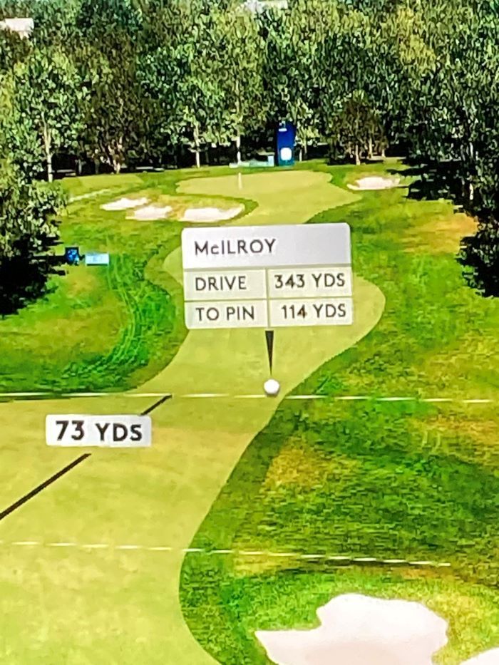 De eerste hole van de West Course van Wentworth was ooit een par 5. De beginhole mat zoals nu 418 meter. Men heeft de hole wel naar een par 4 terug gebracht. Maar het blijft toch een gemakkelijke voor bijvoorbeeld Rory McIlroy. Drive van 314 meter en shot naar de pin van 104 meter.Wel voorbij het brede en dus veilige landingspunt.