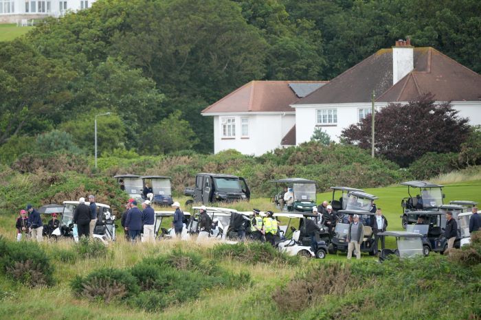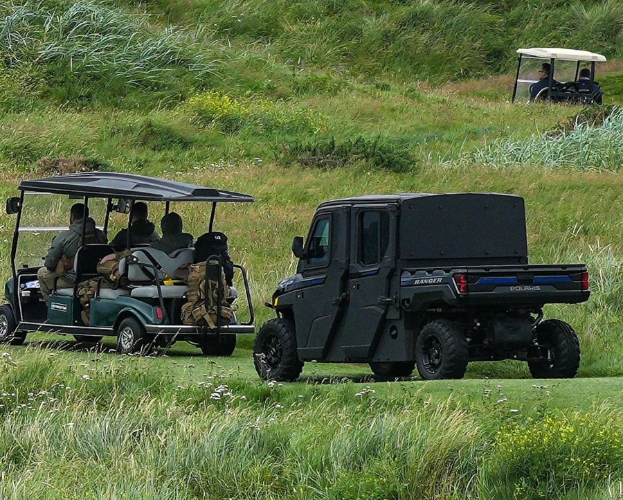 In de cavalcade van buggies die de Amerikaanse president op een golfbaan volgen, is er ook een speciale gepantserde buggy die als “Golf Force One” aangeduid wordt. Voor als er weer op Trump zou geschoten worden…De “Golf Force One” achteraan de reeks buggies.
