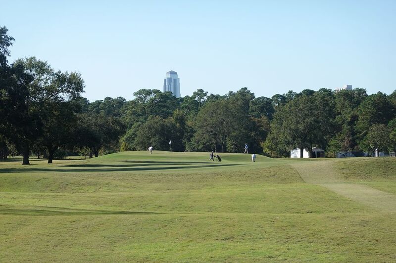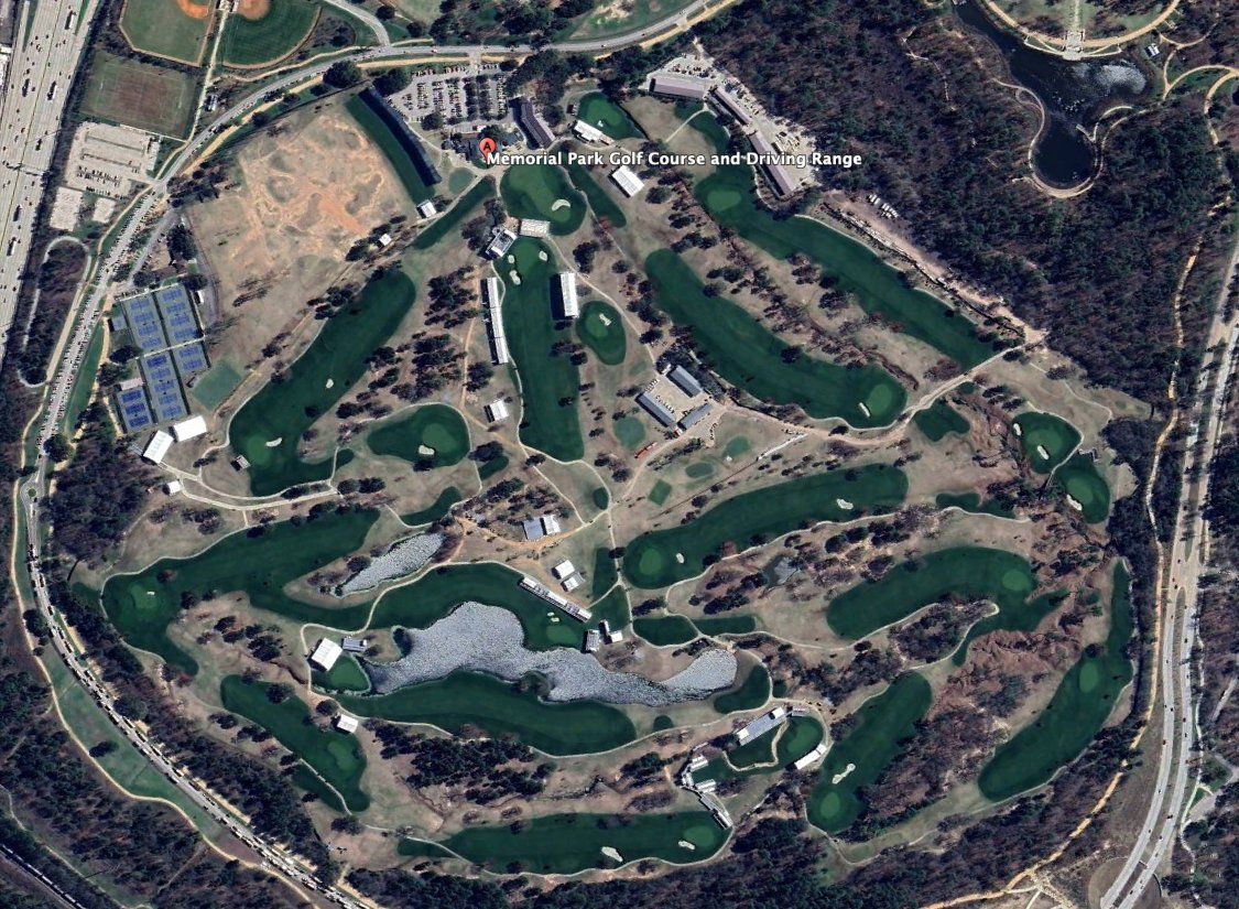 Een luchtfoto van Memorial Park Golf waar de Texas Children’s Houston Open gehouden wordt. Wanneer je goed kijkt tel je slechts twintig bunkers. Slechts één hole, de 18de, heeft meer dan twee bunkers. Zes andere geen enkele.Vroeger telde Memorial Park er 54, maar sinds de upgrade die Tom Doak met de hulp van Brooks Koepka doorvoerde, werd dat aantal tot 20 herleid. Veel zandbunkers werden grasbunkers.
