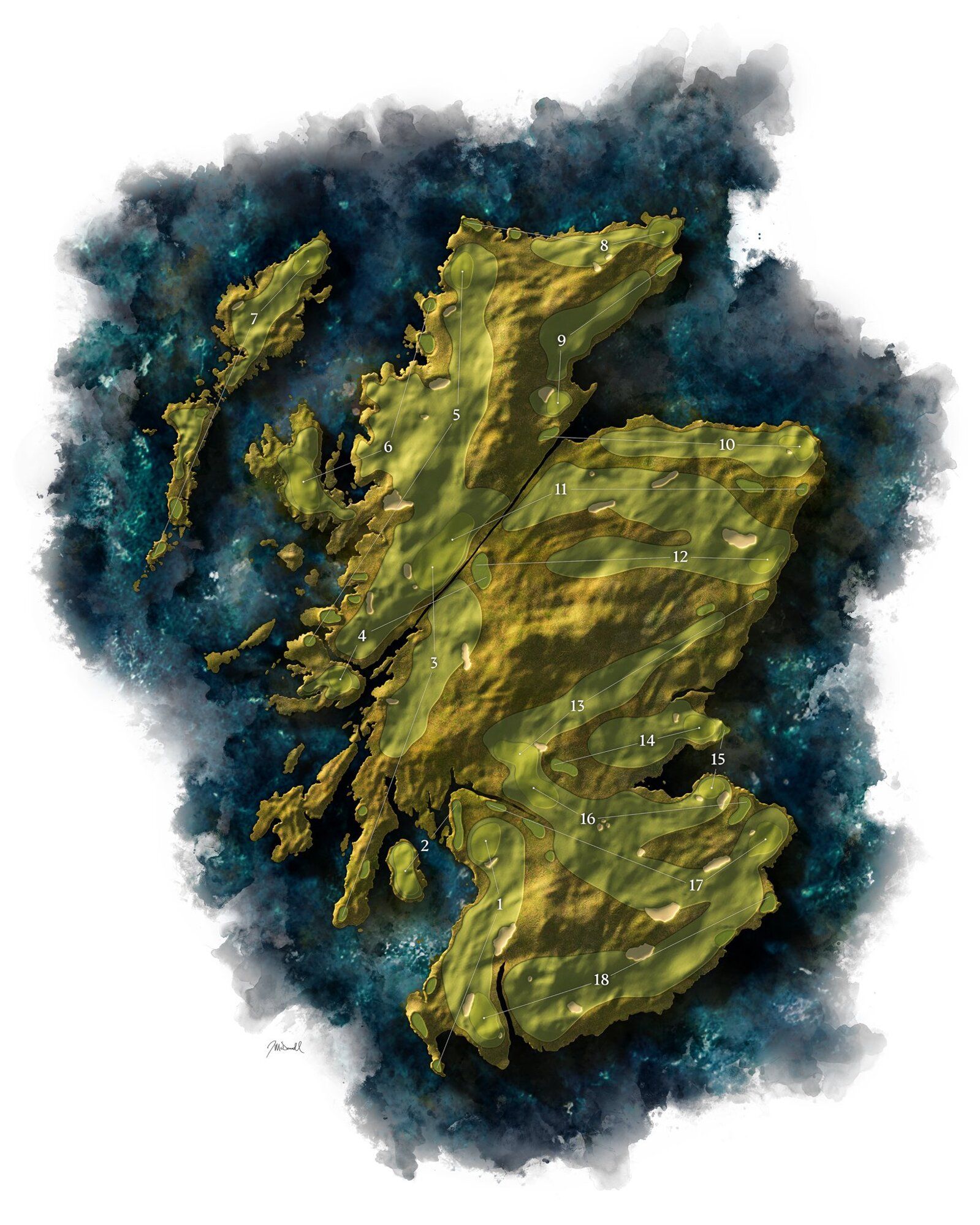 Iemand heeft in Schotland een virtuele achttien holesbaan uitgetekend.