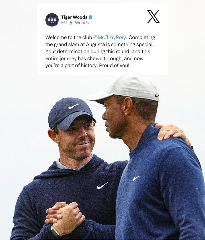 Tiger Woods was één van de allereersten die Rory McIlroy met zijn Masters-zege en de Career Slam feliciteerde. “Welcome to the Club”.