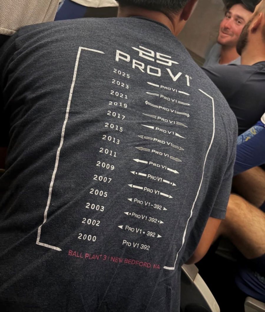 De Pro V1 bal van Titleist verscheen in 2000 op de golfbanen. Sindsdien heeft de bal een hele evolutie meegemaakt. Ook veranderde de oplijning op de bal. Het t-shirt van deze man toont dat.