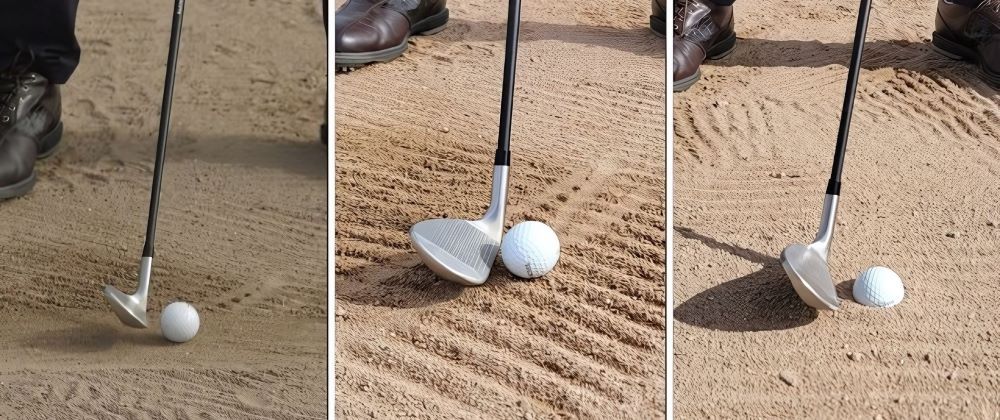 De ideale positie van je clubblad bij een bal in de bunker. Drie verschillende liggingen, drie verschillende approaches