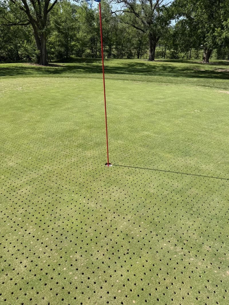 Het prikken of beluchten van de greens is belangrijk voor het onderhoud van het gras en de bodem.