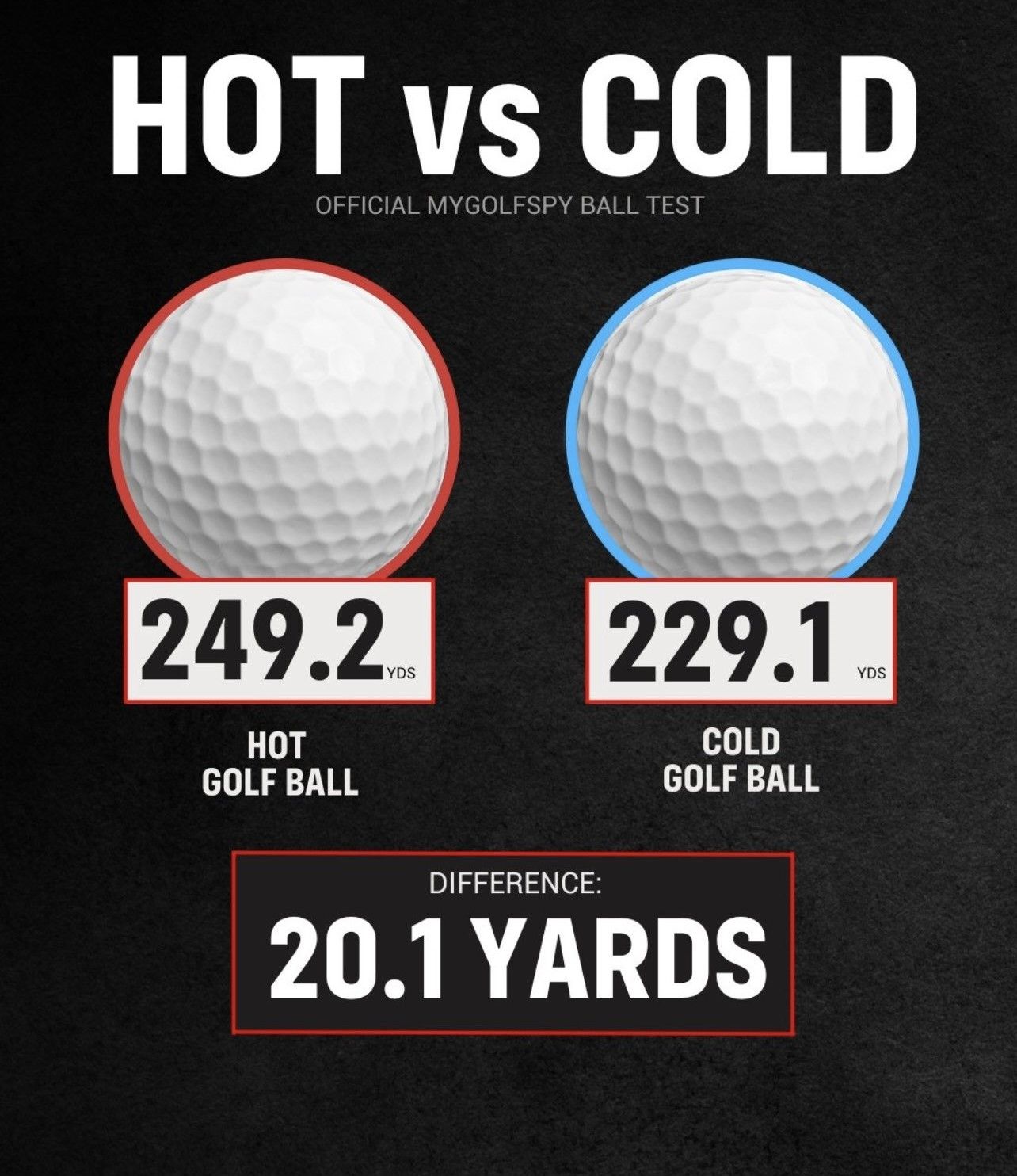 Een test van MyGolfSpy leerde dat een een warme golfbal verder vliegt dan een koud exemplaar. Men kwam op een gemiddeld verschil van wat meer dan 18 meter uit.Dus je ballen warm houden…